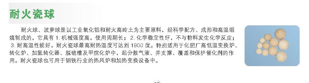 3. 耐高溫性能好,耐火瓷球高耐熱溫度可達(dá)到 1900 度。特別適用于化肥廠高低溫變換爐、轉(zhuǎn)化爐、加氫轉(zhuǎn)化器、脫硫槽及甲烷化爐中,起分散氣液、并支撐、覆蓋和保護(hù)催化劑的作用。耐火瓷球也可用于鋼鐵行業(yè)的熱風(fēng)爐和加熱變換設(shè)備中。耐火瓷球分普通耐火球和高鋁耐火球,普通耐火球適用于硫酸和化肥行業(yè)的轉(zhuǎn)化器和變換爐,高鋁耐火球適用于尿素、鋼鐵等行業(yè)的熱風(fēng)爐、加熱變換爐等設(shè)備。本站還有介紹陶瓷散堆填料